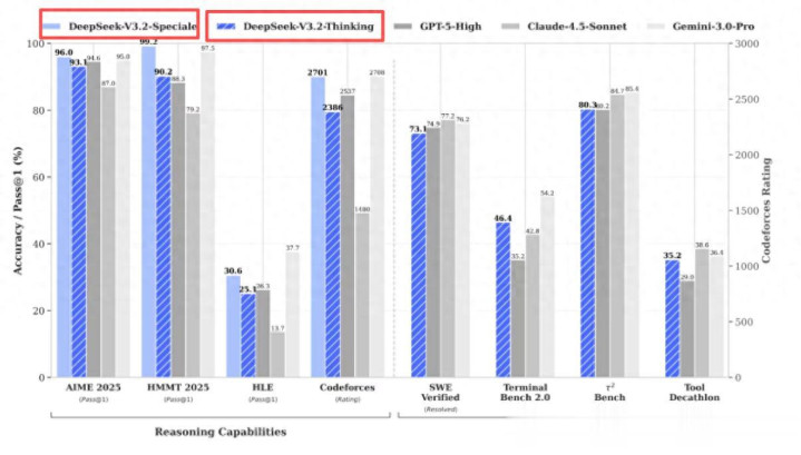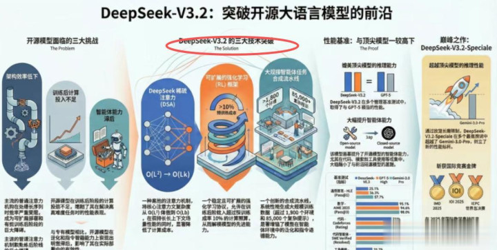 而V3.2-Speciale特别版则聚焦极限推理能力,在IMO、CMO、ICPC、IOI等全球顶级竞赛中斩获金牌,其数学证明与逻辑验证能力已逼近人类顶尖选手水平。