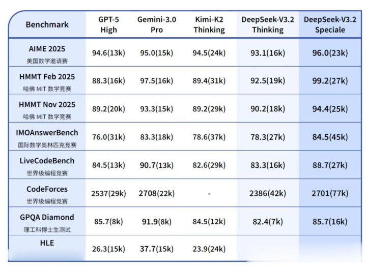 从公开报道的数据来看,V3.2标准版在公开推理Benchmark中达到GPT-5水平,仅略逊于Gemini-3.0-Pro,同时显著优化输出长度与响应效率,适用于日常问答、通用Agent等高频率场景。
